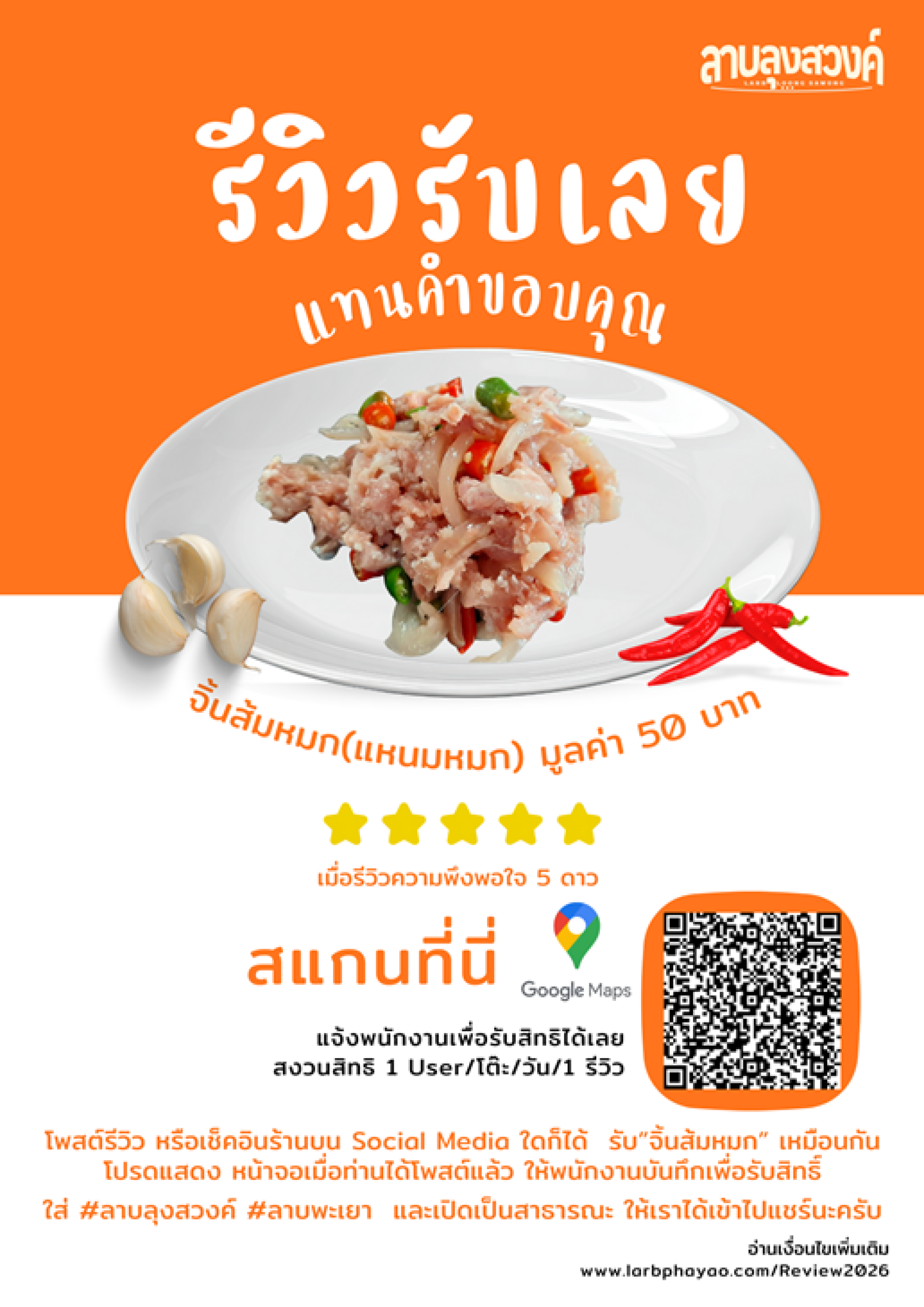 1. การเข้าร่วมรายการ ลูกค้าสามารถเข้าร่วมแคมเปญนี้ได้ โดยการ รีวิว หรือเช็คอินร้านลาบลุงสวงค์ ผ่านช่องทางโซเชียลมีเดีย เช่น Facebook, Instagram, TikTok, Google Maps หรือแพลตฟอร์มอื่นที่สามารถแสดงตัวตนของผู้โพสต์ได้อย่างชัดเจน